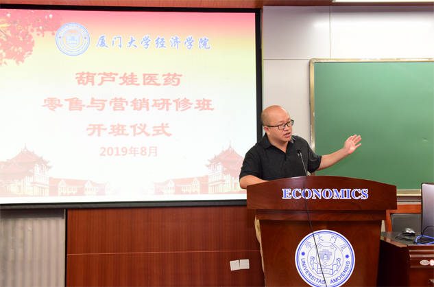 在开班仪式上,廖景峰主任首先代表厦门大学经济学院热烈欢迎伟德国际1949医药零售与营销研修班的学员到厦大学习,并就厦门大学及经济学院的相关情况进行了介绍。他说,伟德国际1949学员走进厦大就是厦大的校友,希望未来的日子能够关心、支持母校的发展,多提宝贵意见,同时他也祝大家在厦大学习期间学有所成、学有所获。